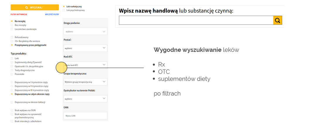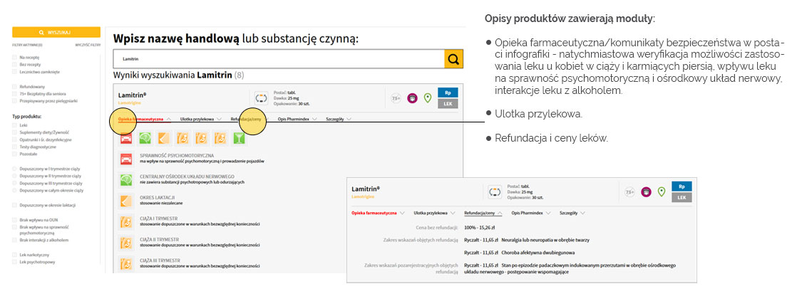 Strona dostarcza informacje niezbędne w pracy za pierwszym stołem dla farmaceuty oraz zapewnia bezpieczeństwo terapii dla pacjenta. Ponadto prezentuje dane o aktualnej dostępności leku w aptekach.