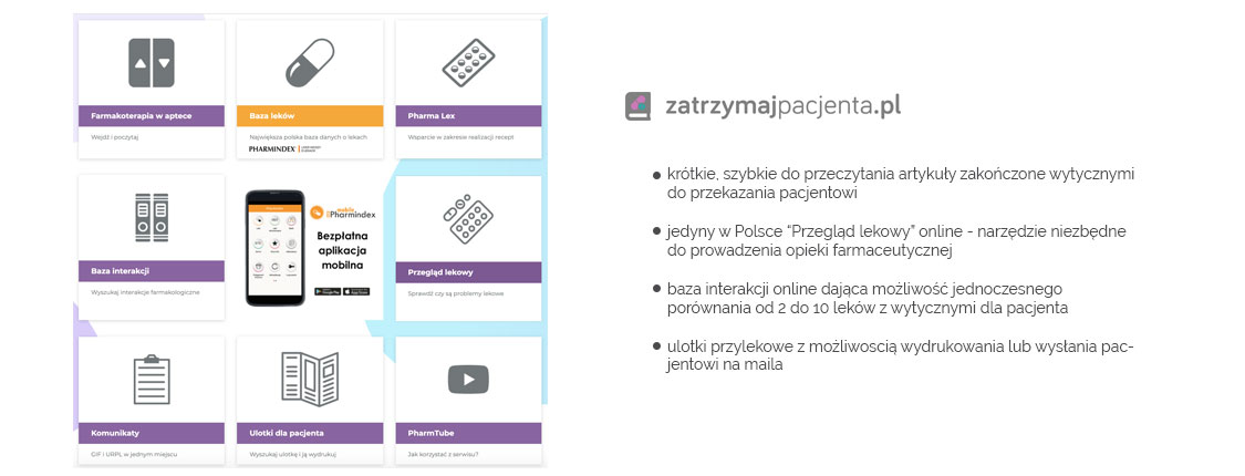 Pharmindex Farmaceuta oraz zatrzymajpacjenta.pl to serwisy dedykowane farmaceutom, oparte o bazy leków Pharmindex i wzbogacone o nowe funkcjonalności przydatne w codziennej pracy w aptece.