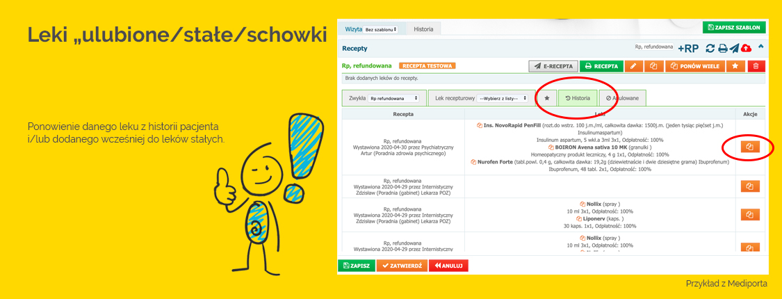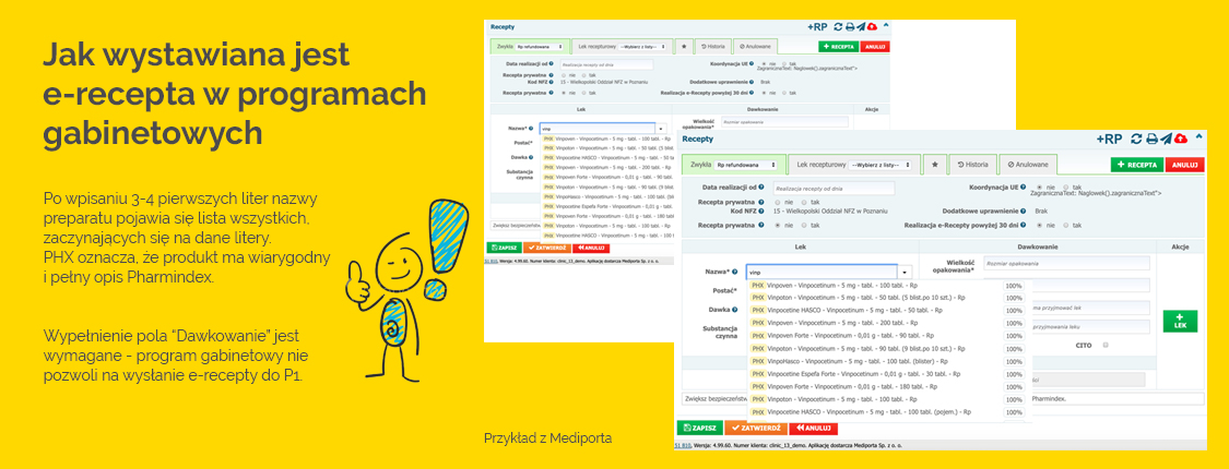 Trener Recept to symulator, który przeprowadzi Państwa poprzez kolejne etapy wypisywania recepty oraz skontroluje jej poprawność. Podpowie prawidłową nazwę handlową leku lub wyświetli leki zawierające poszukiwaną substancję czynną. Na każdym kluczowym etapie poinformuje jakie warunki należy uwzględnić na recepcie, na co zwrócić uwagę, co przeliczyć, tak aby recepta została wypisana prawidłowo. Jest to unikalne rozwiązanie łączące wiedzę o produktach leczniczych dostępnych na rynku z aktualnymi przepisami prawnymi i zasadami wystawiania recept.
